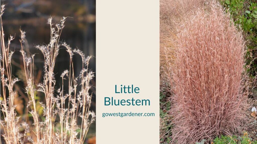 Little bluestem has a bluish-green color in the summer. But in the fall and winter, it can turn a reddish-bronze color and get airy seed heads. The winter color will vary slightly by the type of little bluestem you choose. (Some popular selections include: ‘Standing Ovation,’ ‘Blaze’ and ‘Prairie Blues.’)
